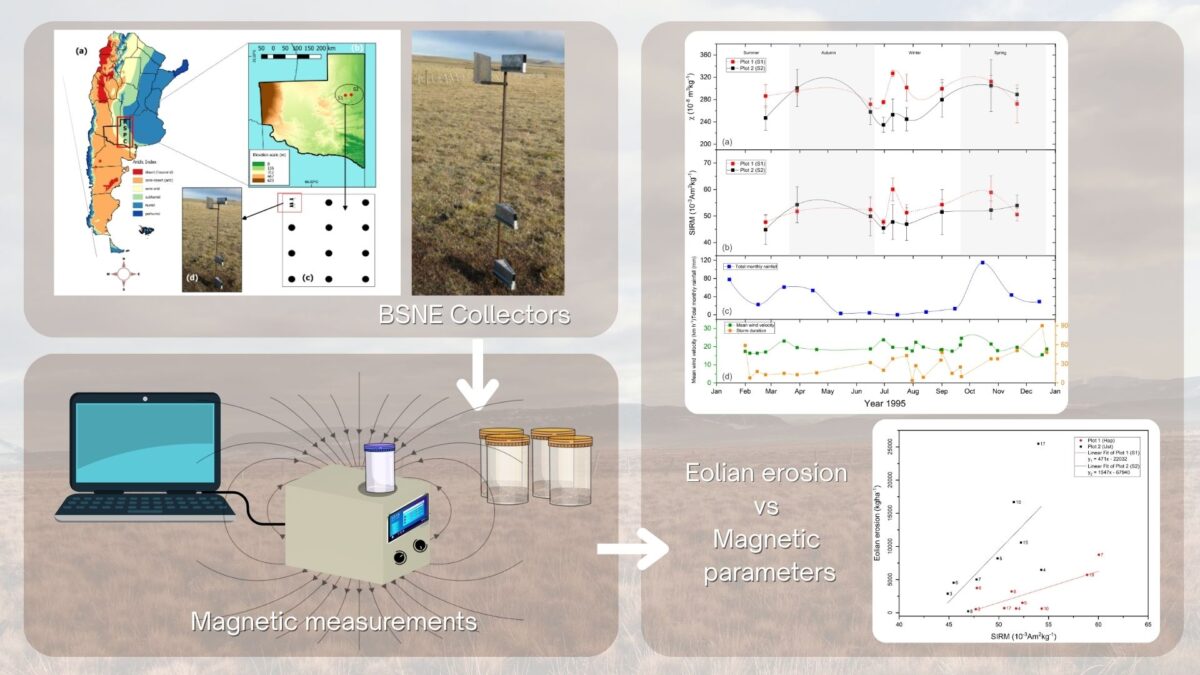 Un nuevo estudio en la región semiárida pampeana (Argentina) aplicó magnetismo ambiental para analizar 9 tormentas de viento en 1995. El grupo de Magnetismo Ambiental encontró que las propiedades magnéticas del suelo (como la SIRM) se correlacionan fuertemente con la pérdida de suelo (hasta 25.472 kg/ha). Estos resultados sugieren que las técnicas magnéticas pueden ser herramientas clave para monitorear y entender la erosión eólica.