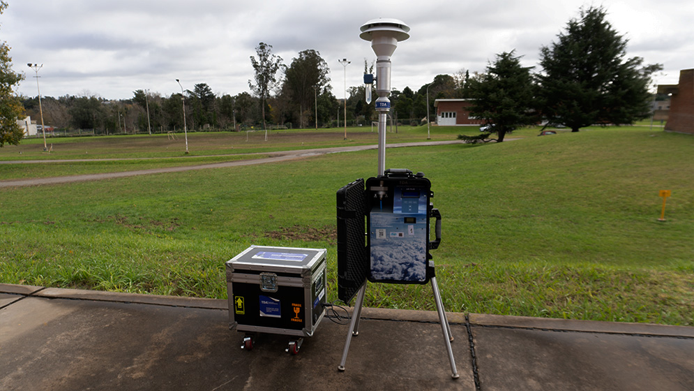 Estación de monitoreo continuo de contaminantes en aire con alimentación por panel solar y fuente para exterior.